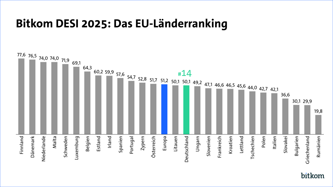 Η νέα έκδοση του Bitkom-DESI 2025, του δείκτη που μετρά τον βαθμό ψηφιακού μετασχηματισμού των κρατών-μελών της Ευρωπαϊκής Ένωσης, σκιαγραφεί μια Ευρώπη με μεγάλες διαφορές — και μια Γερμανία που, παρά τη βελτίωσή της, εξακολουθεί να κινείται στη «μεσαία ταχύτητα» της ψηφιοποίησης.