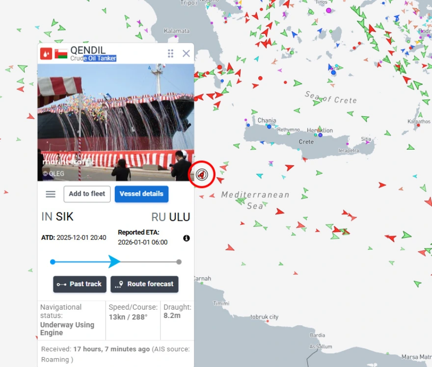 Σύμφωνα με την υπηρεσία marinetraffic, το πιο πρόσφατο στίγμα του δεξαμενόπλοιου «QENDIL» ήταν πριν 17 ώρες, μεταξύ της ΝΑ Κρήτης και της Λιβύης. Δείτε την εικόνα: